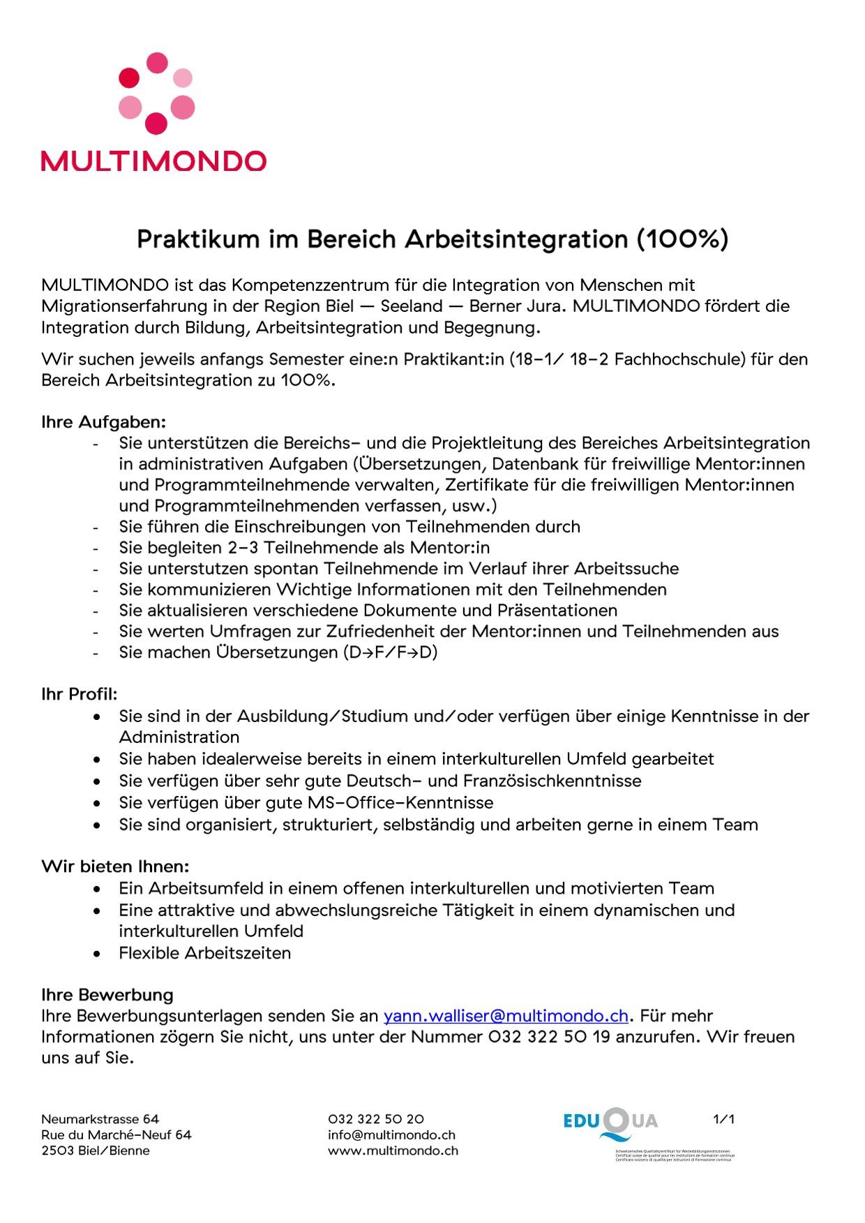 Wir suchen jeweils anfangs Semester eine:n Praktikant:in (18-1/ 18-2 Fachhochschule) für den Bereich Arbeitsintegration zu 100%.